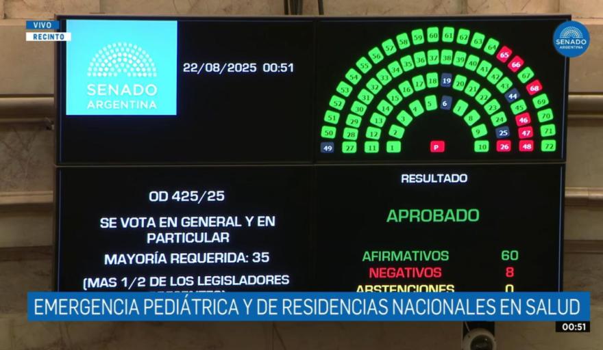 Ley de Emergencia en Salud Pediátrica: Este proyecto, que prevé mayores recursos para el sector, la recomposición salarial para los profesionales y la derogación de una resolución del Ministerio de Salud que modificaba el sistema de residencias médicas, fue convertido en ley con 62 votos positivos y 8 negativos.