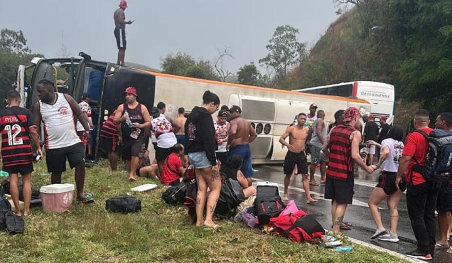 Un micro que transportaba a hinchas del Flamengo hacia Buenos Aires para el partido de semifinal de la Copa Libertadores contra Racing Club, volcó aparatosamente en la autopista Via Dutra, cerca de Río de Janeiro.