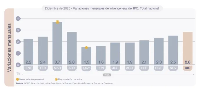 La inflación registró una aceleración y fue del 2,8% en diciembre, y acumuló 31,5% en el 2025, según informó el Instituto Nacional de Estadísticas y Censo. A su vez, la variación mensual fue de 0,3%, ya que la inflación de noviembre se ubicó en 2,5%.