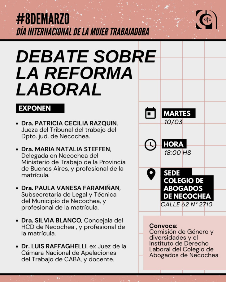 En el marco de las actividades por el Día Internacional de la Mujer Trabajadora, el Colegio de Abogados de Necochea será sede hoy de un debate abierto sobre la reforma laboral, que reunirá a especialistas del ámbito judicial, académico y de la administración pública.