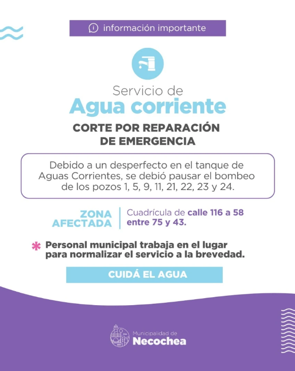 La Municipalidad de Necochea acaba de emitir un comunicado de "Información Importante" para alertar a la población sobre un corte imprevisto en el servicio de agua corriente que afecta a un sector clave de la ciudad.