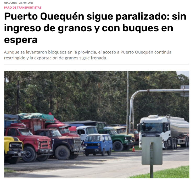 El conflicto en Quequén se sostiene incluso mientras otros puntos de la provincia comienzan a normalizar su operatoria. La persistencia del bloqueo mantiene frenado el ingreso de camiones y limita la capacidad de carga de buques, en un momento clave para la logística del sector.